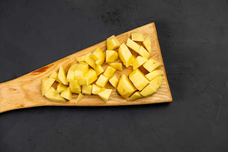 Sliced raw potatoes on a cutting wooden board. dark background. Preparation for cooking. Food background. Recipe.