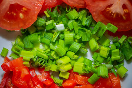 Tomatoes, peppers and herbs chopped into pieces. Close up ingredients for cooking.