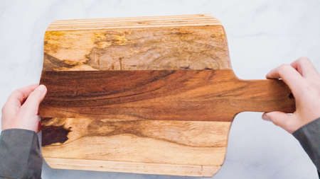 empty rectangular wooden board and female hands with a knife, top view