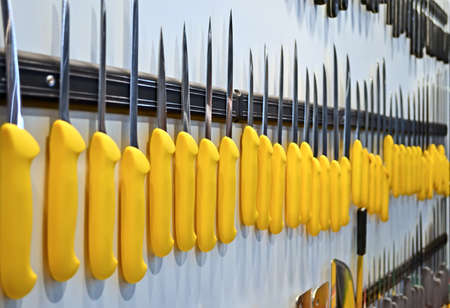 set of high quality kitchen cook knives tools on a magnet board hanging on the wall