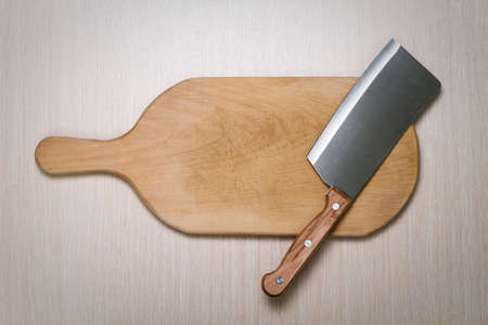 big ancient cleaver ready to be used again, on top of an old wooden cutting board with copy space