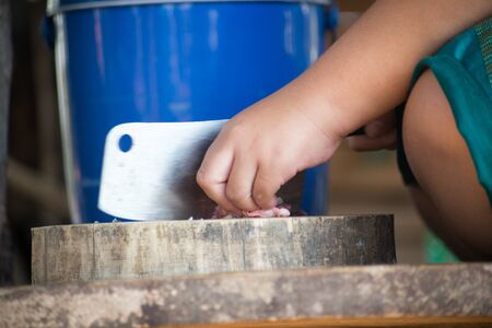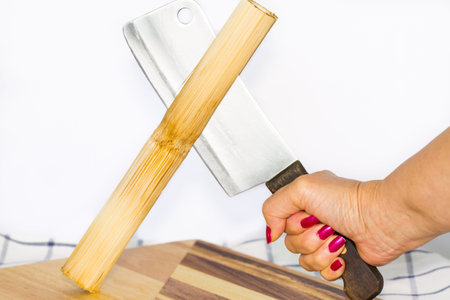 Woman's hand cutting glutinous rice roasted in bamboo joints