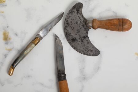 english knife and old rusty cleaver on a vintage wooden tabetop