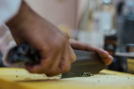 A closeup of a chef chopping greens in the kitchen