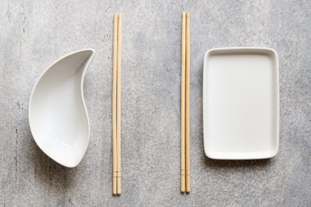 Ceramic plate and black wooden chopsticks for dinner in asian restaurant