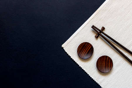 Rustic table setting with chopsticks for dinner in asian style on dark wooden table with copyspace