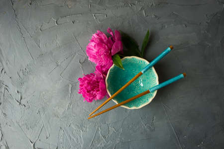 Summer table setting for dinner with asian dishes with bright peonies on dark rustic table with copyspace