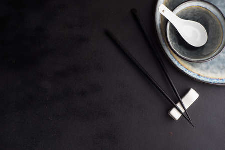 Empty plate, spoon and chopsticks on black table in asian restaurant, close up, top view. Table setting