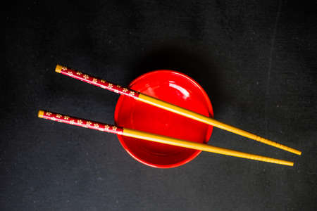 A visually striking arrangement featuring a red bowl and chopsticks on a textured background, capturing the beauty of traditional design with modern elegance.