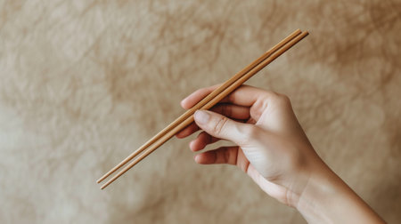 Hand holding wooden chopsticks with textured background, minimalistic dining concept