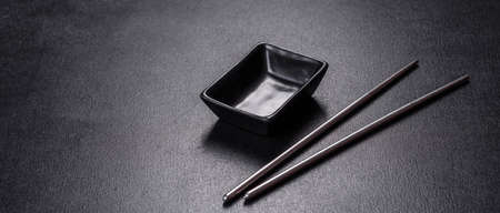 Empty ceramic dish or plate and asian chopsticks on black wooden background