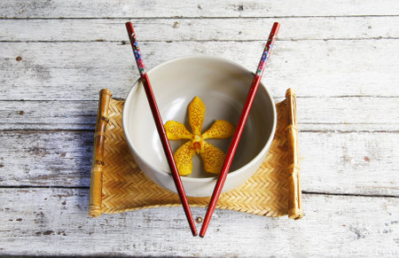 ceramic bowl and chopsticks in bamboo tray on wooden table
