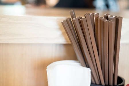 Bundle of black chopsticks in a plastic jar (restaurant)