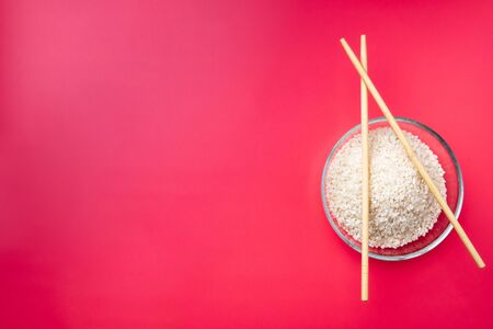 Flat lay. Transparent glass bowl with rice and chopsticks on a pink background.
