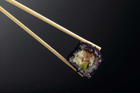 Fresh tasty sushi with smoked eel and black caviar in wooden chopsticks on a dark background. Copy space.