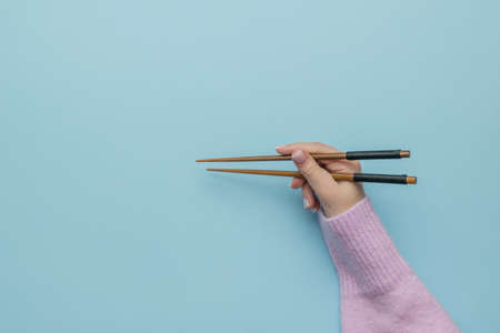 Hands holding chopsticks. Isolated on blue background, the place for caption and text.