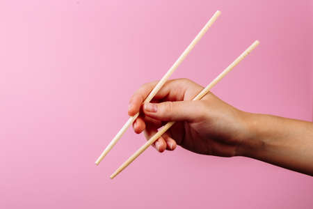 Hands holding chopsticks. Isolated on pink background, the place for caption and text.