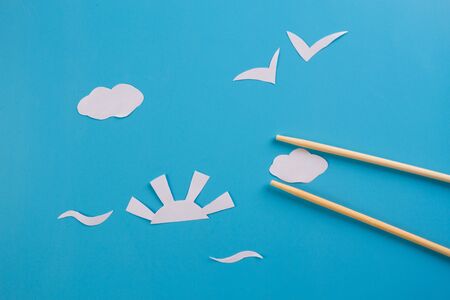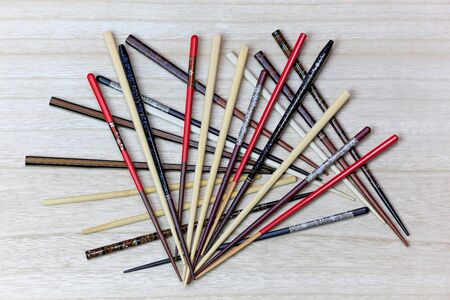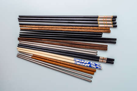Top view view of Asian chopsticks for eating with all kinds of colors and materials on a blue background