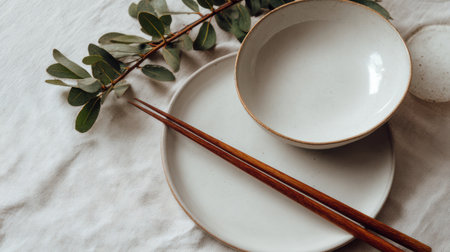 Minimalist zen table setting with plain ceramic dishes, wooden chopsticks, and a single sprig of greenery