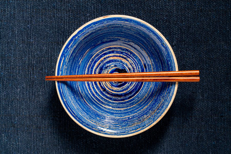 A pair of wooden chopsticks lying across an empty soup bowl on blue fabric background, close up, top view