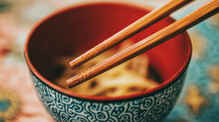 A beautifully crafted bowl holds steaming noodles with elegant chopsticks poised above, all set against a vibrant, colorful fabric background, evoking warmth and tradition.