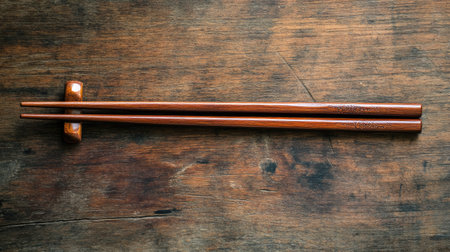 Beautiful wooden chopsticks lay atop a rustic wooden table, showcasing their elegant design. Perfect for dining scenes or culinary themes.