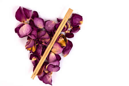 Heart shaped pressed dried rose petals, light background, vintage tone. Copy space.