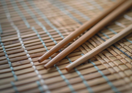 Close up of wooden chopsticks arranged on a textured bamboo mat background, showcasing their natural color and craftsmanship