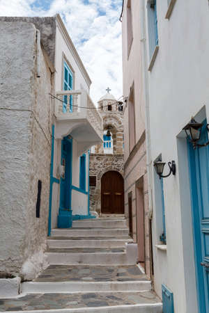 Traditional Cycladitic alley with a narrow street, whitewashed houses in lefkes Paros island, Greece