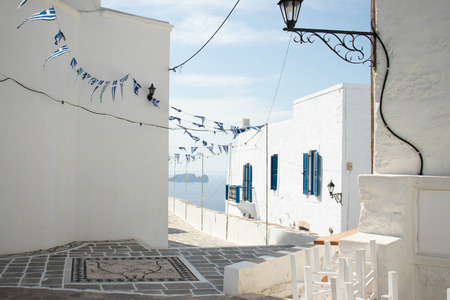 Cyclades Kythnos island, Greece. Whitewashed buildings, narrow cobblestone street. Chora village traditional architecture in white and blue colors. Summer vacations destination, space, card template