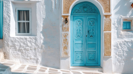 A light blue door with intricate carvings on a whitewashed building in a Mediterranean town