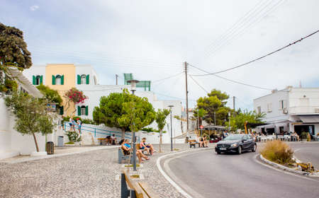 Pyrgos, Santorini island/ Greece-15JUL2019. Main street/ square of small village called Pyrgos on island of Santorini. Tourists sit and relax.