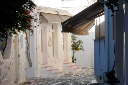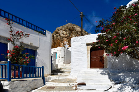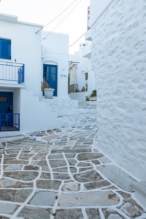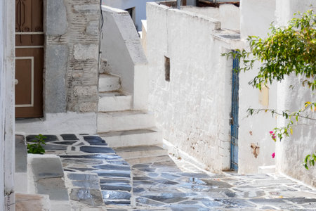 Lefkes, Paros Island, Greece - 27 September 2020: Narrow street of the old town. Traditional, withe architecture and a stone path with white joints.