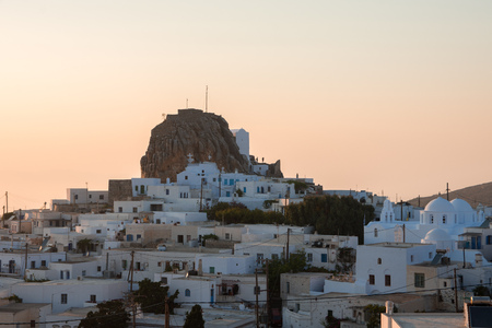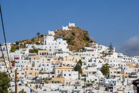 White Greek houses on a hill in the town of Chora in Ios island. Cyclades, Greece
