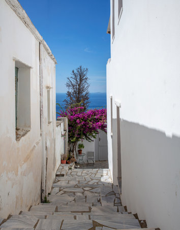 Tinos island Greece. Cycladic architecture in white at Kardiani village. Paved alley and stairs, pot with pink bougainvillea. Vertical