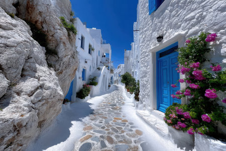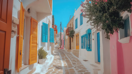 Charming alley in a greek island town, featuring classic cycladic architecture under a clear blue sky. A.I.