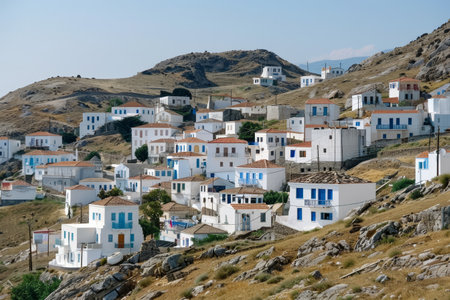 A picturesque hillside village displays an array of traditional white houses basking in the daylight, surrounded by lush greenery and a tranquil atmosphere, showcasing local architecture.