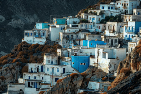 A picturesque village perched on a hillside features whitewashed houses with vibrant blue shutters. The warm sun illuminates the rocky terrain, showcasing the serene Mediterranean charm.