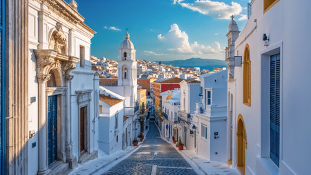 A sunny street in a traditional maritime Greek village. Ai generated.