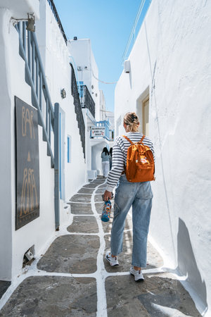 Mykonos Town, Greece - September 23, 2019: Man in red t-shirt walking past shops and restaurants on a narrow street in Hora (also known as Mykonos Town), the islands well-preserved port and capital.