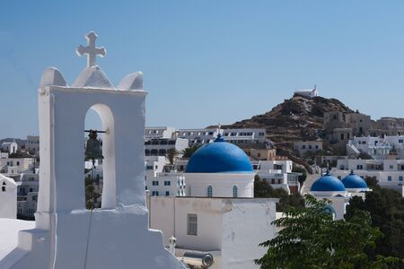 Greece, the island of Ios. A view over the old village with a church bell in the foreground, and a chapel on a hill in the background.