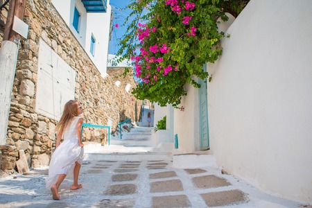 Charming girl in white dress having fun outdoors on Mykonos streets