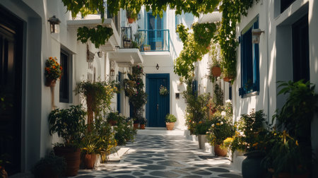 In a tranquil Mediterranean village, a narrow alleyway unfolds, lined with lush greenery and colorful pots. Sunlight filters through the leaves, creating a serene atmosphere to enjoy.