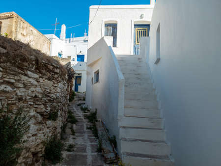 Greece. Tinos island of art, Cycladic architecture at Pyrgos village paved street, whitewashed wall, stair, sunny day.