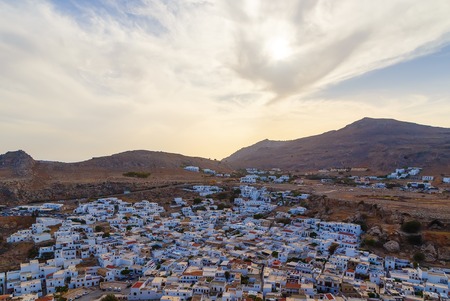 Lindos , Rhodes Greece. Top view of sunset against mountains.
