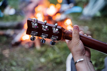 Guitar fretboard pegs, macro shooting, musical instrument, hand holding guitar by the fretboard, clamp strings, campfire trek with song, wristband bracelet