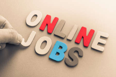 Word jobs on dark background, work announcement, hiring and unemployment concept