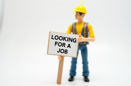 toy man holding a sign with the text (I'm looking for a job) on a white background