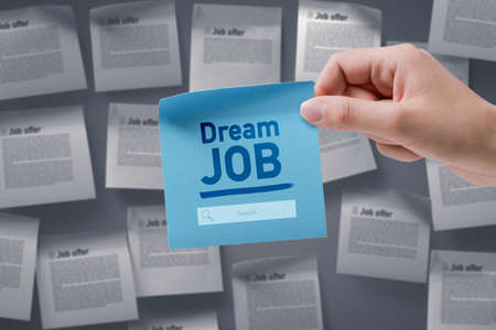 Woman holding a sticky note with job search app and search bar, many job offers in the background