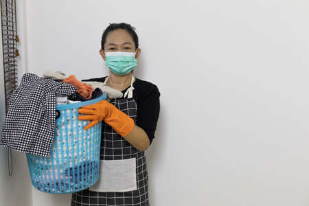 Asian Woman in a housekeeper looks wearing apron cleaning gloves face mask and carrying a laundry basket to prepare for washing. Mom and wife do housework concept. front view white background portrait